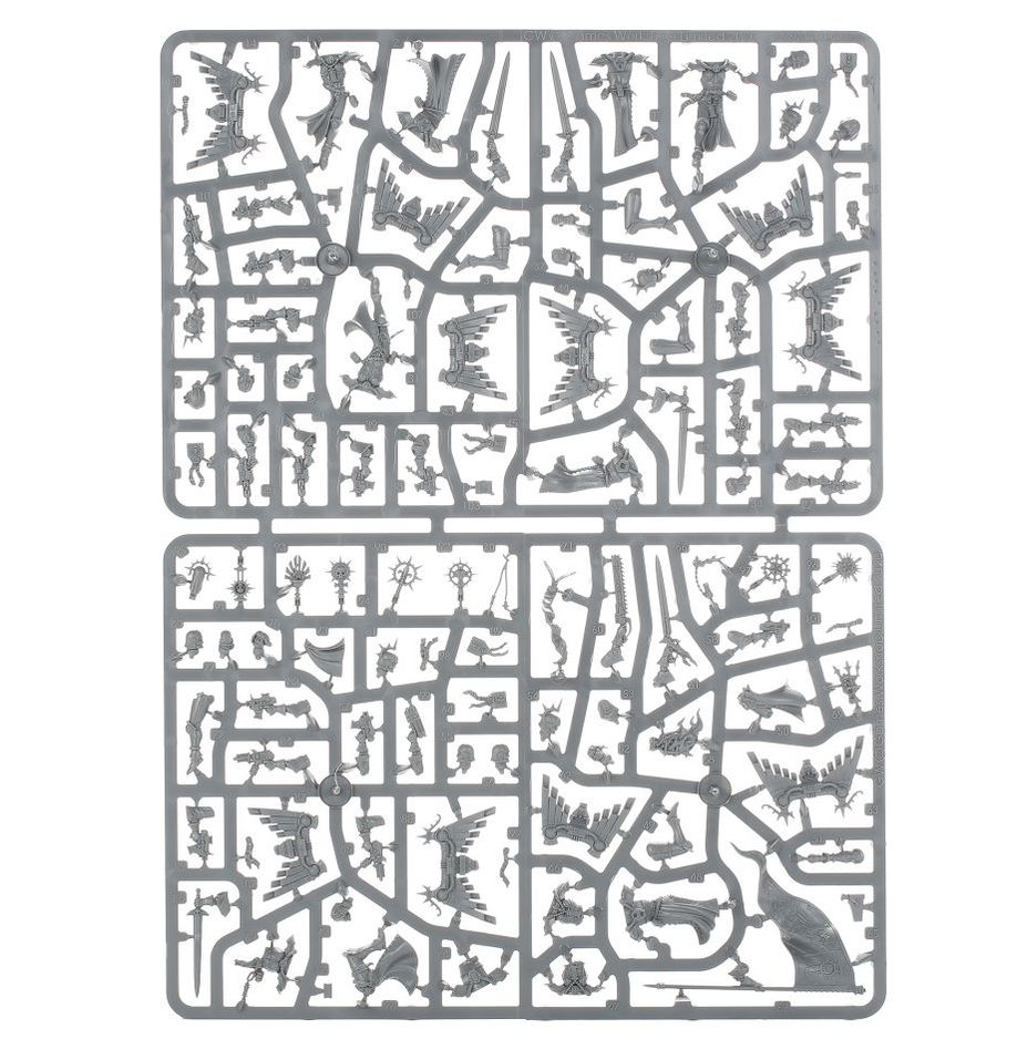 The kit builds five Zephyrim. The Zephyrim each carry a pistol and power sword, though two of their number can instead be equipped with hand flamers while two more can bear inferno pistols. One model can be assembled as a Zephyrim Superior, who can either replace her bolt pistol for a plasma pistol or bear a fluttering Zephyrim pennant.